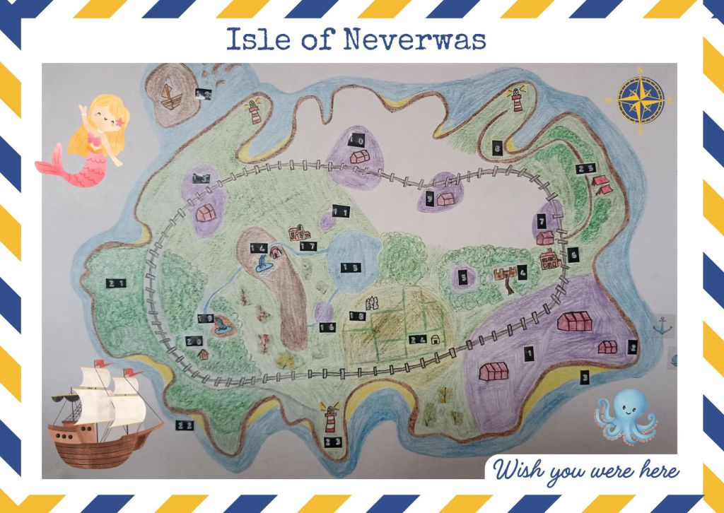 Welcome to the Isle of Neverwas. Travelling Ava has been busy creating a map of the island as she adventures from place to place. Bumble and Ava are working hard at the Lost and Found Exchange to write a guidebook to help you navigate the different locations as you explore the island. We’ll keep you posted with any updates from Bumble’s guidebook. Have fun exploring.
